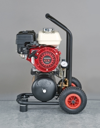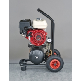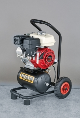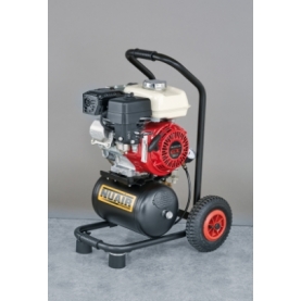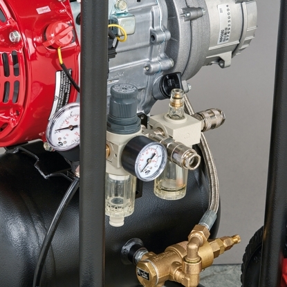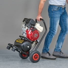 Compresor de gasolina con motor HONDA que cumple con las emisiones mas estrictas. Ligero y compacto, todos sus componentes protegidos gracias a la carcas de acero. Regulador de presión sobredimenado con doble salida de aire comprimido. Las ruedas semi-neumáticas ni se deshincha ni se pinchan.