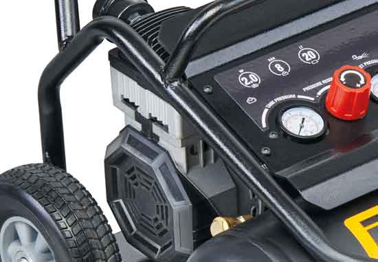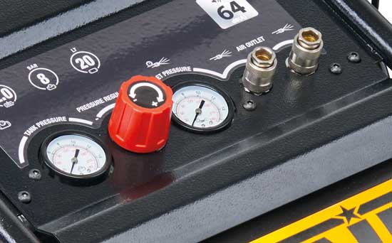 | Cuadro de mandos integrado . Manómetros de gran tamaño colocados en el compresor para garantizar una fácil lectura. Regulador de presión más ergonómico equipado con un innovador ajuste de "clic". | ![]() |