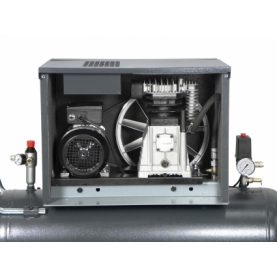 Compresor de piston insonorizado portatil, con caja metalica insonorizada que reduce el nivel sonoro y protegiendo a la vez los elementos moviles. Creando un ambiente de trabajo mas comodo y un alto nivel de proteccion.