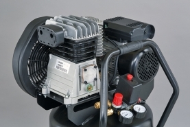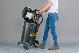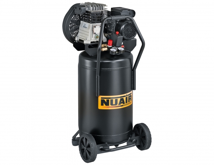 Compresor de piston, Para completar la gama de compresores NU-AIR, se ha diseñado la serie “vertical”, de gran utilidad en situaciones de falta de espacio. Estas máquinas aúnan un volumen reducidísimo con todas las ventajas ilustradas en las páginas precedentes. Igual reserva de aire en la mitad de espacio. Filtro de aspiración de grandes dimensiones, proyectado para reducir el ruido y optimizar el rendimiento del compresor. Grupo de bombeo bi-estadio con cilindros de fundición dotados de amplias tomas de aire para la refrigeración del aire comprimido acumulado en el depósito. Robusto cubre-correa de plástico que protege todas las partes en movimiento. Mientras tanto, sus amplias aberturas aumentan la ventilación del grupo de bombeo.