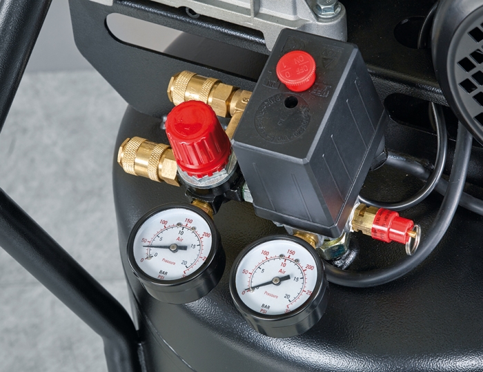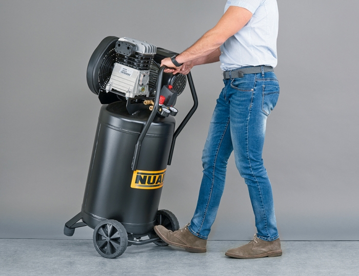 Compresor de piston, Para completar la gama de compresores NU-AIR, se ha diseñado la serie “vertical”, de gran utilidad en situaciones de falta de espacio. Estas máquinas aúnan un volumen reducidísimo con todas las ventajas ilustradas en las páginas precedentes. Igual reserva de aire en la mitad de espacio. Filtro de aspiración de grandes dimensiones, proyectado para reducir el ruido y optimizar el rendimiento del compresor. Grupo de bombeo bi-estadio con cilindros de fundición dotados de amplias tomas de aire para la refrigeración del aire comprimido acumulado en el depósito. Robusto cubre-correa de plástico que protege todas las partes en movimiento. Mientras tanto, sus amplias aberturas aumentan la ventilación del grupo de bombeo.
