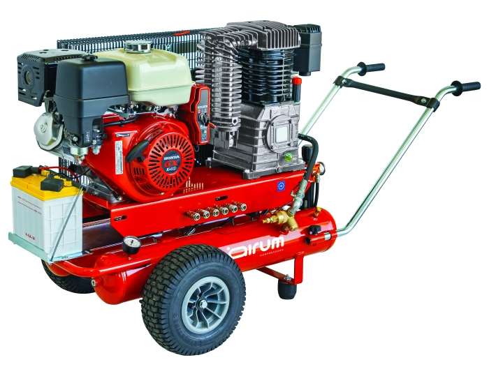 Incluye batería para el arranque, filtro-regulador-lubricador, manómetro de glicerina y distribuidor con enchufes rapidos. Compresor con asas desmontables y ruedas neumáticas.