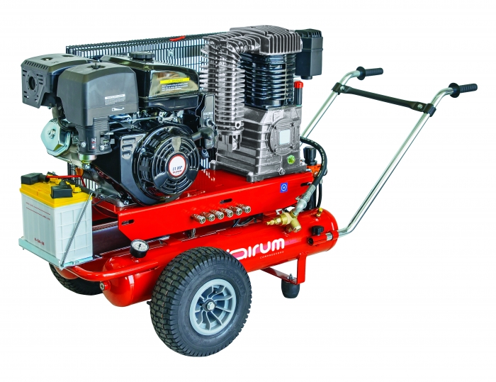 Incluye batería para el arranque, filtro-regulador-lubricador, manómetro de glicerina y distribuidor con enchufes rapidos. Compresor con asas desmontables y ruedas neumáticas.