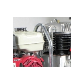 Compresores con motor de gasolina, supervisados por HONDA. Montados sobre deposito de 100 lts. Motor de explosión HONDA conforme a las más severa normativa de emisiones. Regulador de presión sobre-dimensionado con doble salida de aire. Barra adicional para levantar la unidad por medio de polipasto o montacargas. El doble asidero y las ruedas semiautomática permiten su transporte sobre cualquier terreno. Las ruedas semiautomática, ni se pinchan ni se deshinchan. Robusta rejilla metálica para la protección de todos los elementos en movimiento.